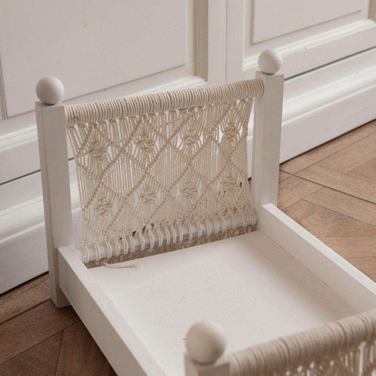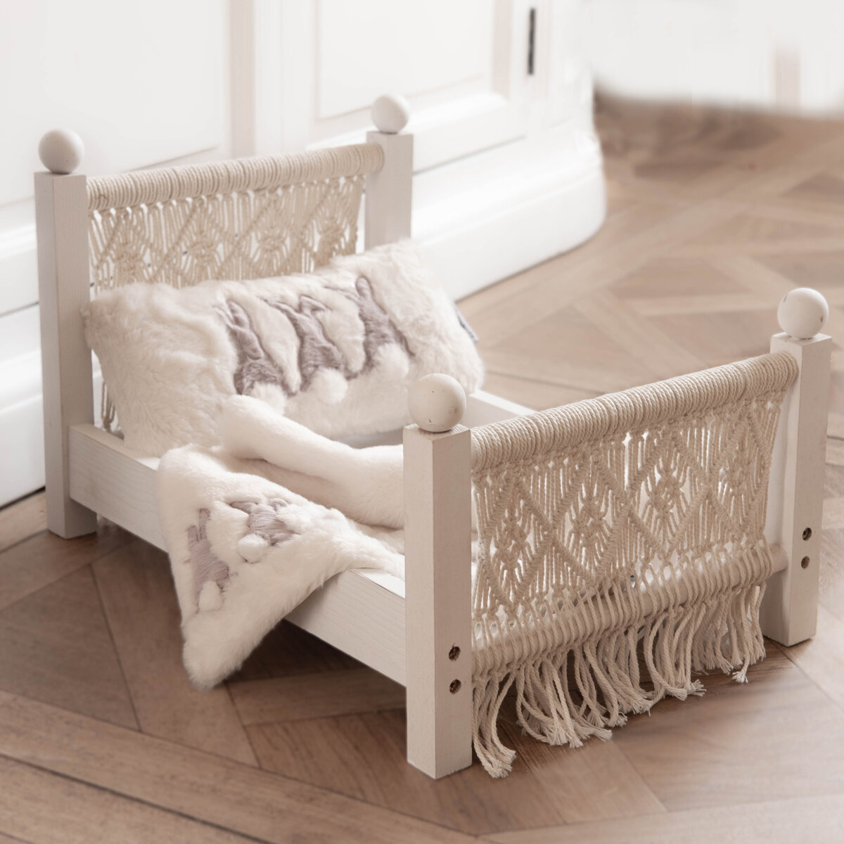 Das Boho Kaninchenbett für deine Kaninchen. Macrameeseildetails am Bett- und Kopfende machen das Bett zu einem wirklichen Hingucker.