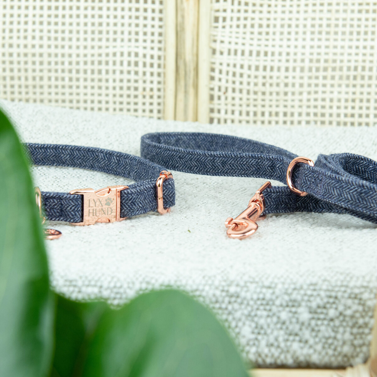 Halsband mit rosegold-Elementen und Lyxhund Anhänger, passende Leine