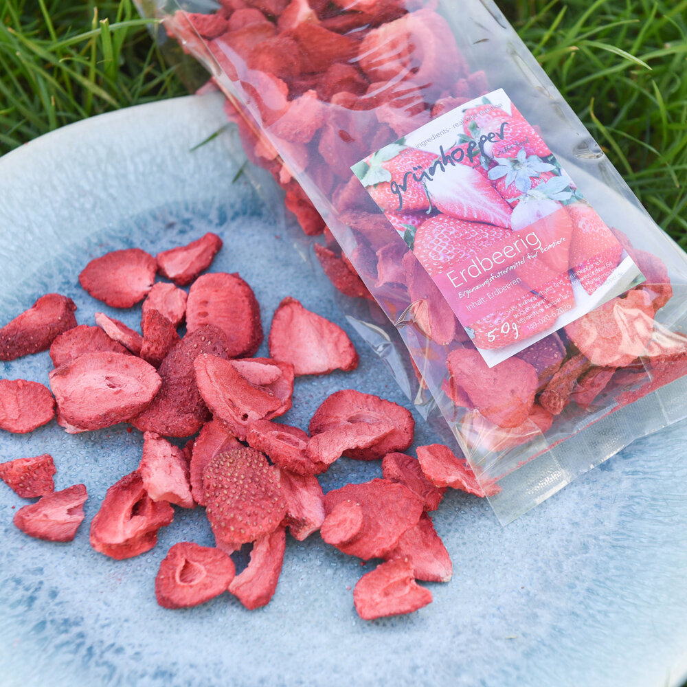 Gefriergetrocknete ganze Erdbeeren in Lebensmittelqualität. Ein Verwöhnsnack für alle Hoppler.