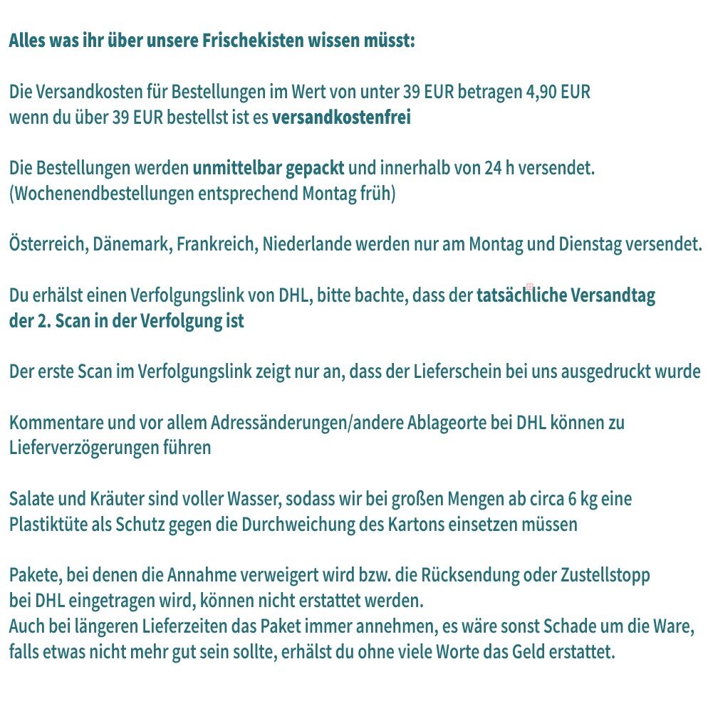 • Bei Versand an Packstation ist keine Frischegarantie möglich und bitte beachten, dass zu große Lieferungen/Pakete nicht in die Packstationen passen, sodass sie dann nicht ausgeliefert werden. Bitte nicht so viel Ware bestellen an Packstationen!