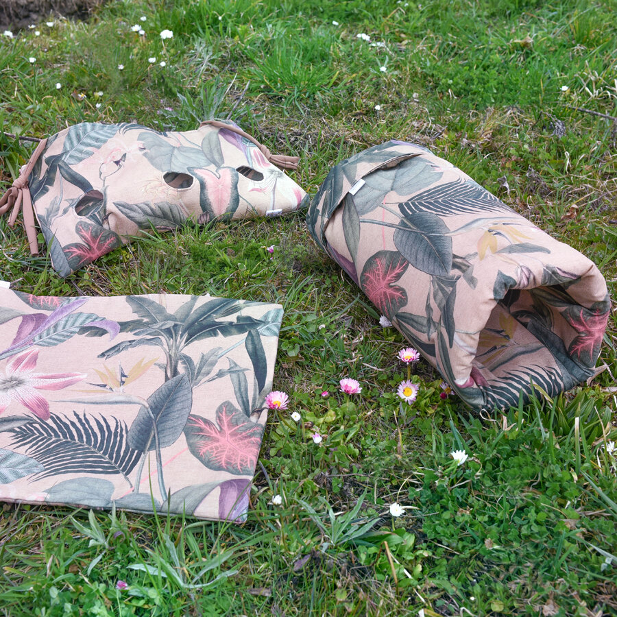 Diese Inhaltsstoffe sind nicht zum Verzehr geeignet. Sollte dies aber mal der Fall sein, ist es unbedenklich und nicht giftig. Der kräftige Baumwollstoff dient als 1. Schutzbarriere der Matte, sollte diese angeknabbert sein, bitte die Matte entfernen.