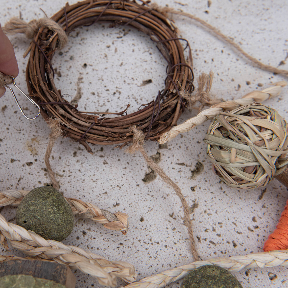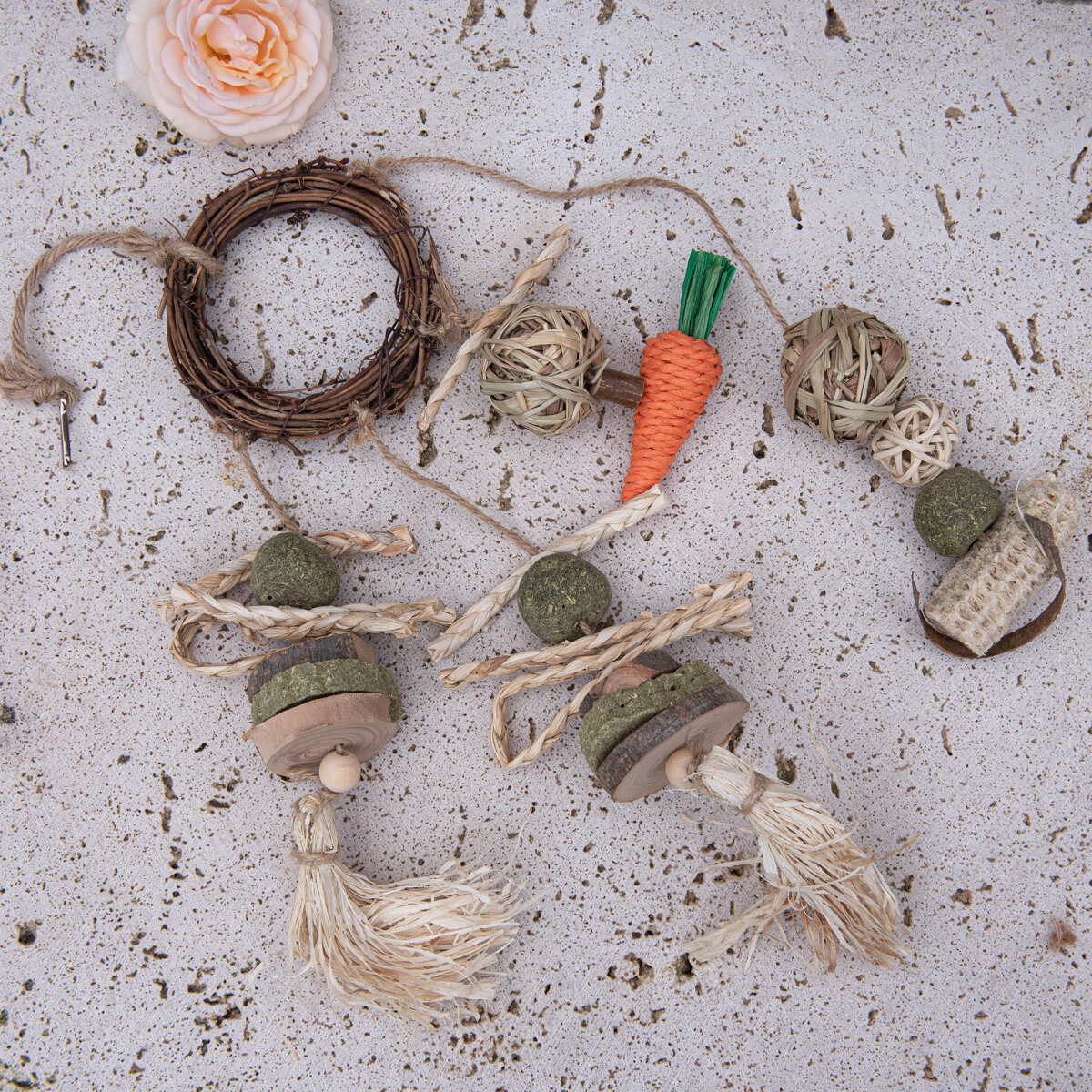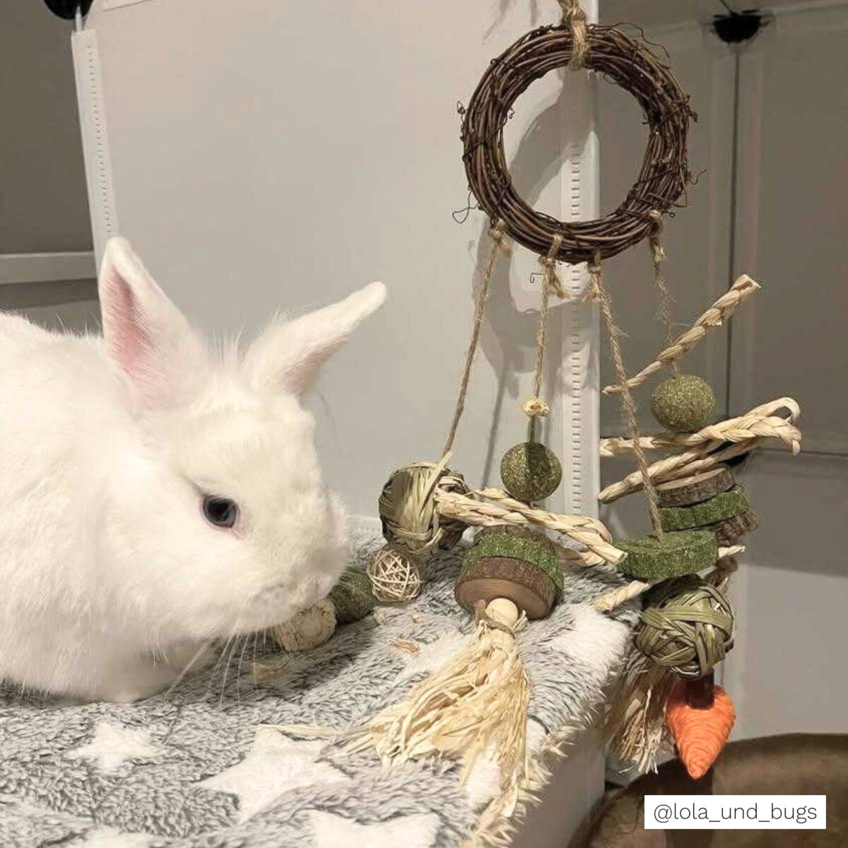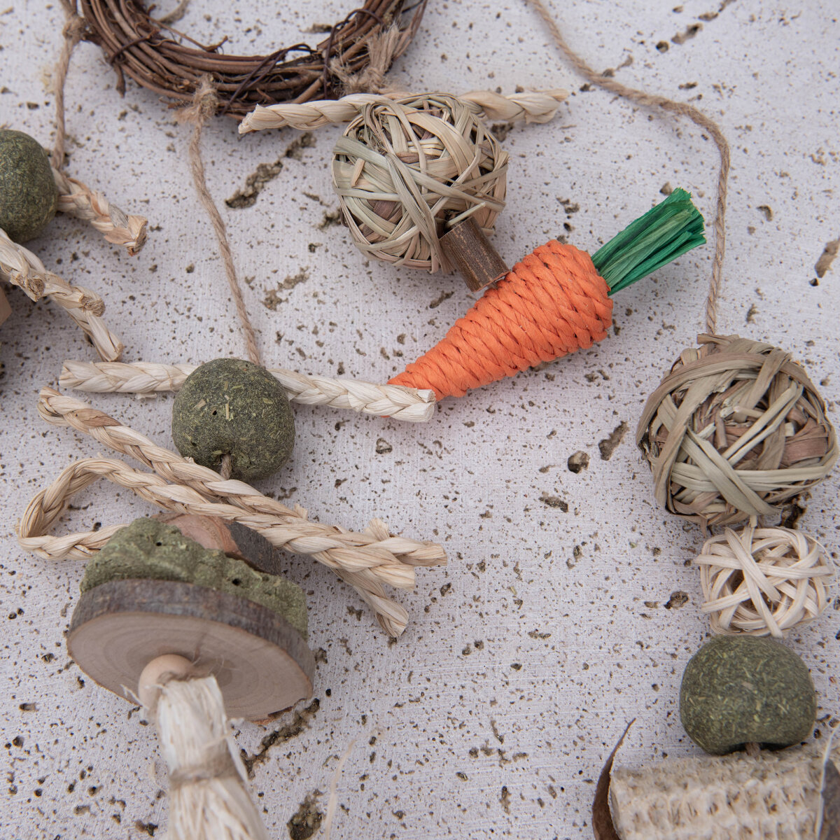 Lustiges Mobile für dein Kaninchengehege. Viele leckere Kleinigkeiten sind munter verteilt.