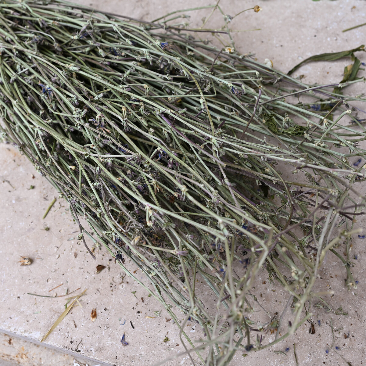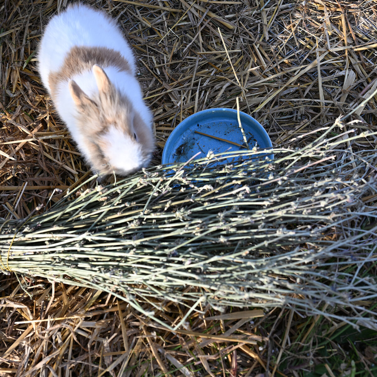 Ein grüner Malvenstrauß mit violetten Blüten bringt den Sommer noch einmal ins Kaninchenzuhause.