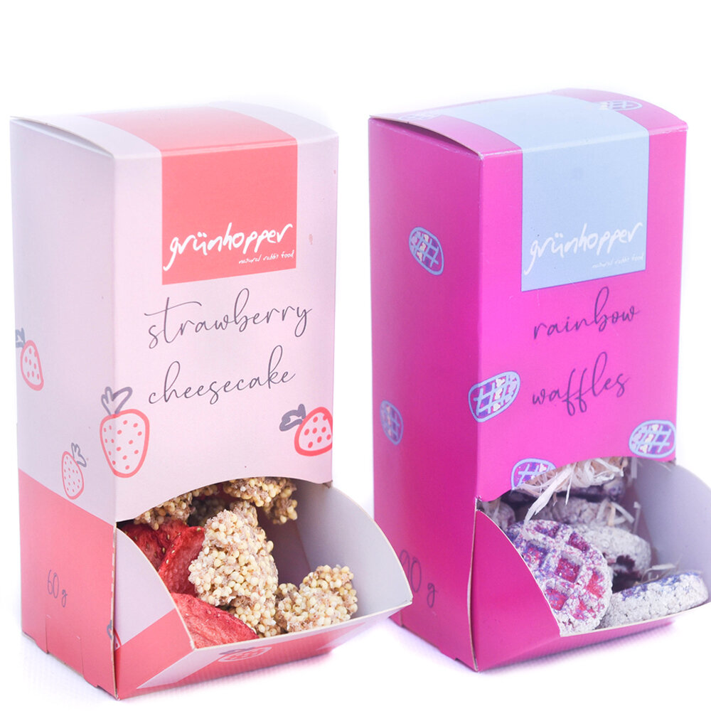 Leckere Snacks für die kleine Belohnung zwischendurch. Ob als Besonderheit beim Clickertraining oder als kleine Aufmerksamkeit für das geliebte Tier: Die Kaninchen lieben es!