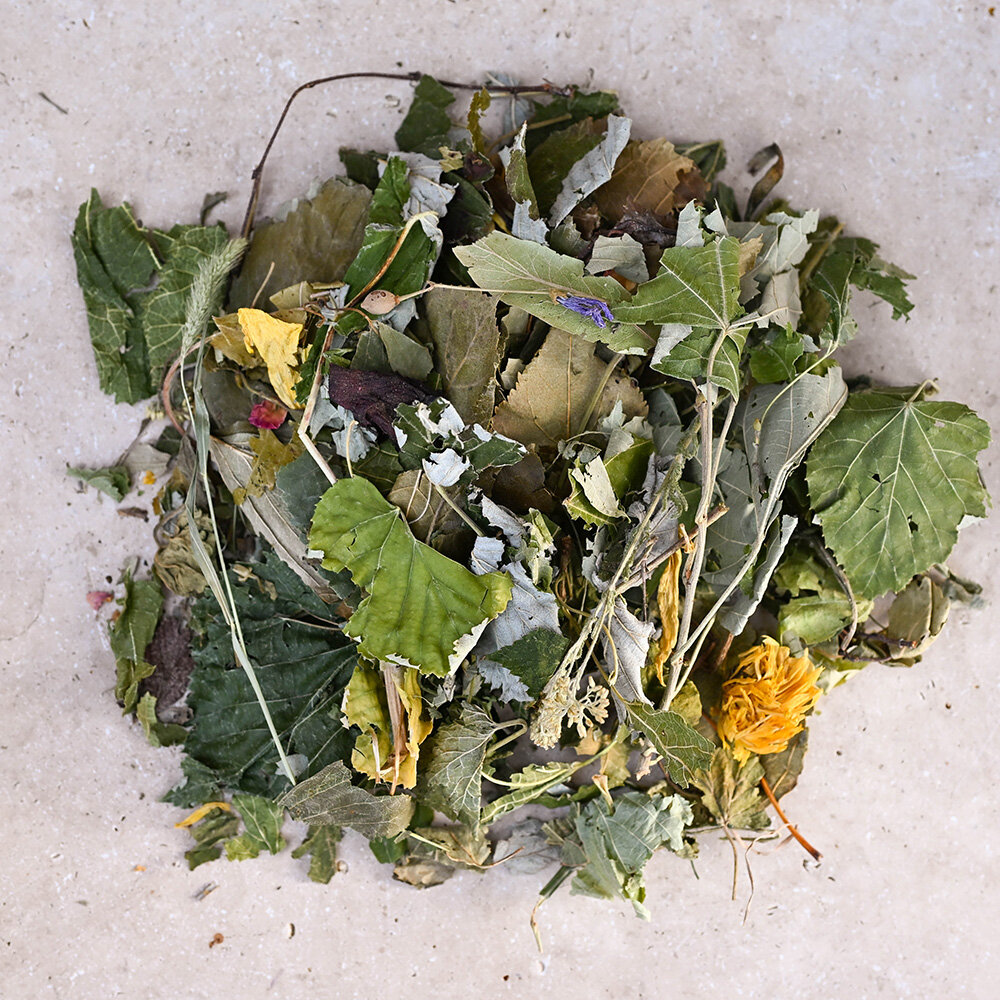 Kirschblätter, Malve, Löwenzahn, Maulbeere, Himbeere, Apfel, Erdbeere, Ginkgo, Haselnuss, Johannisbeere, Weide, Brombeere, Linde, Birke, Schafgarbe, Ringelblume, Hibiskus, Kornblume, Kaktus, Rose, Kamille, Sonnenblume